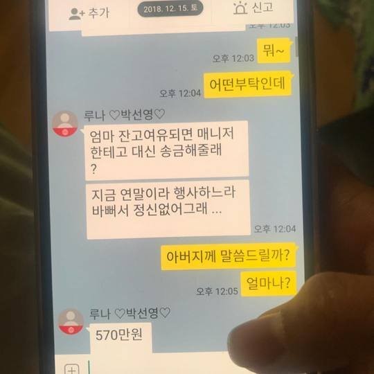 루나는 "요즘 유행하고 있는 보이스피싱인데 제 네이버 주소록을 해킹해서 카카오톡으로 저인 척 아이디를 루나, 박선영으로 이름을 바꾸고 돈을 빌려 달라는 사례가 발생 하고 있다. 절대 속으시면 안된다"고 말했다.