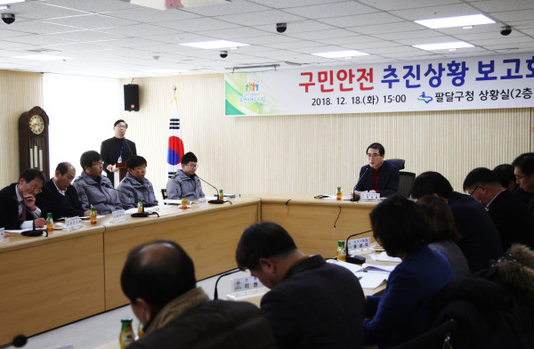 경기 수원시 팔달구는 지난 18일 수원중부경찰서 등 유관기관, 구 안전사업추진 부서장 등 23명이 참석한 가운데 2018년 하반기 구민 안전 추진상황 보고회 및 팔달 안전실무협의회를 개최했다. 사진은 한상율 구청장 및 참여자들이 토론하는 모습. (사진제공=수원시청)