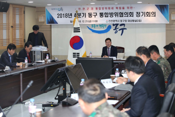 21일 인천 동구가 구청 대상황실에서 통합방위태세 확립을 위한 ‘2018년 4분기 통합방위협의회’를 열고 위원 변동사항 보고, 통합방위협의회 심의안건 처리 등을 실시했다. 사진은 회의 진행 모습. (사진제공=인천동구청)