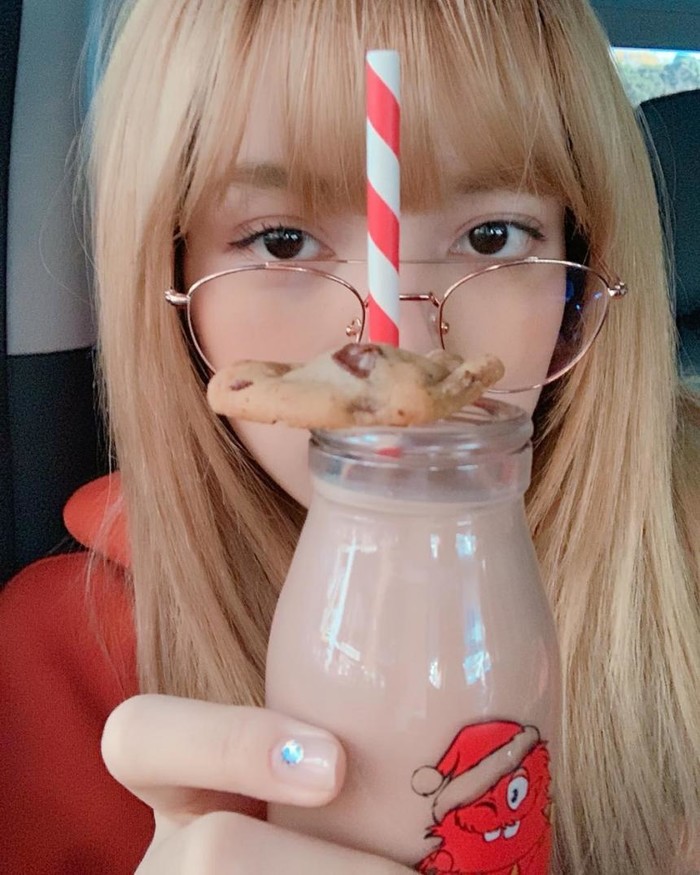 공개된 사진 속 리사는 화장기 없는 얼굴에 얼굴만 한 초코우유를 들고 카메라를 보고 있다.