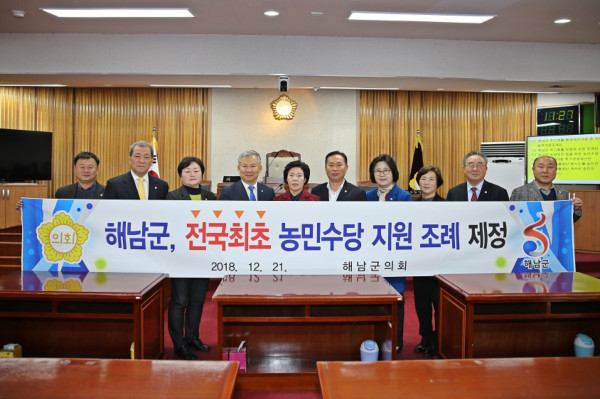 해남군 농민수당 지원 조례가 군의회를 통과함에 따라 농민수당 지원의 법적 근거를 확보한 해남군은 농민수당을 2019년부터 반기별 지급하게 됐다.