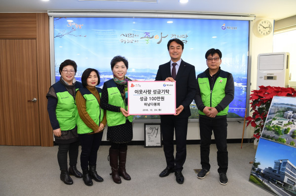 경기 하남시 다봉회는 24일 시청을 방문해 이웃돕기 성급 100만원을 기탁했다. 이날 김상호 시장 등 8명이 참석했으며, 성금은 복지사각지대 청소년 5명에게 전달된다. 사진은 김상호 시장과 다봉회 관계자들이 기념촬영을 하는 모습. (사진제공=하남시청)