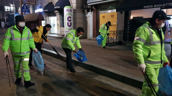 오세현 충남 아산시장이 26일 오전 아산시 환경미화원 및 자원순환과 직원과 함께 가로청소를 실시하고 현장에서 묵묵히 아산시를 쓸고 닦고 있는 환경미화원 등을 격려했다. 사진은 오 시장(가운데)이 환경미화원들과 쓰레기를 수거하고 있는 모습. (사진제공=아산시청)