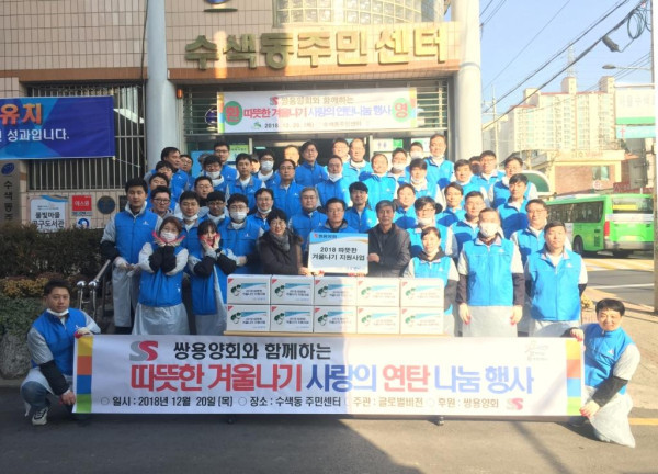 서울 은평구 수색동 주민센터에서는 최근 저소득 홀몸노인 및 취약계층의 따뜻한 겨울나기를 위한 '사랑의 연탄 및 김치나눔 봉사활동'을 실시했다. 사진은 봉사활동에 참여한 관계자들이 기념촬영을 하는 모습. (사진제공=은평구청)