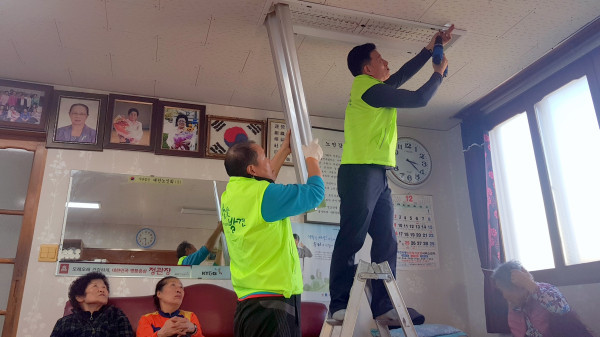 경기 동두천시 중앙동 행정복지센터는 지난 24일 지역내 중앙할머니경로당의 LED조명 교체를 통해 에너지 복지 구현에 앞장섰다. 이날 LED조명 교체는 중앙동 지역사회보장협의체와 자유총연맹의 후원으로 진행됐다. 사진은 참여자들이 조명을 교체하고 있는 모습. (사진제공=동두천시청)