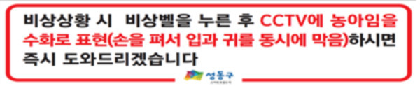 안내표지에는 ‘비상상황시 비상벨을 누른 후 폐쇄회로(CC)TV에 농아임을 수화로 표현(손을 펴서 입과 귀를 동시에 막음)하면 즉시 도와 드리겠습니다’라고 표기돼 있다.