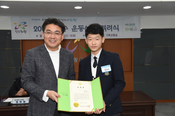 노원구는 26일 구청에서 ‘노원구 우수 운동선수 격려’ 행사를 개최했다. 이번 행사는 우수 운동선수에게 격려금을 전달하는 자리로 마련됐다. 사진은 오승록 구청장(왼쪽)이 우수 운동선수에게 표창을 수여하고 함께 기념촬영을 하는 모습. (사진제공=노원구청)