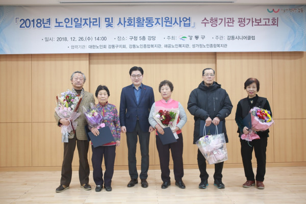 서울 강동구가 26일 ‘노인일자리사업 평가보고회’를 개최했다. 이번 보고회는 유공자 표창, 사업추진실적 보고, 만족도 조사 결과, 우수사업 발표, 향후 일자리 발전방안 제시 등의 순서로 진행됐다. 사진은 이정훈 구청장 및 참여자들이 기념촬영을 하는 모습. (사진제공=강동구청)