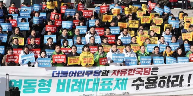 27일 오후 국회 본청 앞 계단에서 열린 바른미래당, 민주평화당, 정의당 등 야 3당 연동형 비례대표제 도입촉구 집회에서 민주평화당 정동영 대표와 참석자들이 기득권 양당을 규탄하며 연동형 비례대표제의 도입을 촉구하고 있다.