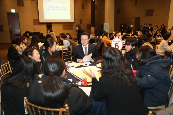 영등포구는 최근 당산그랜드컨벤션에서 지역내 중·고등학교 청소년 100여명이 참석한 가운데 구 교육정책에 대한 청소년들의 의견수렴을 위해 타운홀미팅을 개최했다. 사진은 타운홀미팅에 참여한 채현일 구청장이 청소년들과 함께 토론하는 모습. (사진제공=영등포구청)