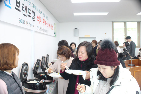 전남 완도군이 최근 농업기술센터에서 전남농업기술원 벼 품종 육종 전문가와 군 관계자, 군 의원, 농협조합장, 소비자 등 100여명이 참석한 가운데 4가지 품종에 대한 미질 평가 및 시식회를 개최했다. 사진은 시식회 참여자들이 평가를 위해 밥을 맛보고 있는 모습. (사진제공=완도군청)