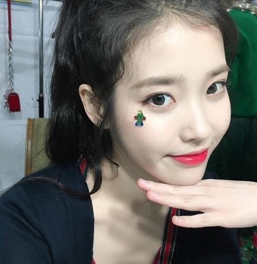 공개된 사진 속 아이유는 한쪽 손으로 턱을 살짝 받치고 상큼한 미소로 카메라를 응시하고 있다. 특히, 인형 같이 오밀조밀한 이목구비와 눈 밑에 붙어있는 반짝이 스티커가 그의 사랑스러운 미모를 더욱 돋보이게 만든다.