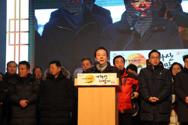 1일 강서구는 2019년 기해년을 맞아 개화산에서 해맞이 행사를 개최했다. 행사는 오전 6시50분에 시작해 공연, 새해소망 다짐, 만세삼창 등으로 진행됐다. 사진은 행사에 참가한 노현송 구청장이 구민들 앞에서 새해 덕담을 전하는 모습. (사진제공=강서구청)