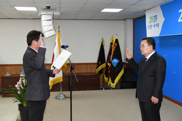 경기 양주시는 2일 시청 대회의실에서 ‘2019년도 기해년(己亥年) 시무식’을 개최했다. 사진은 이성호 시장 및 관계자가 반부패 청렴서약 선서를 하고 있는 모습. (사진제공=양주시청)
