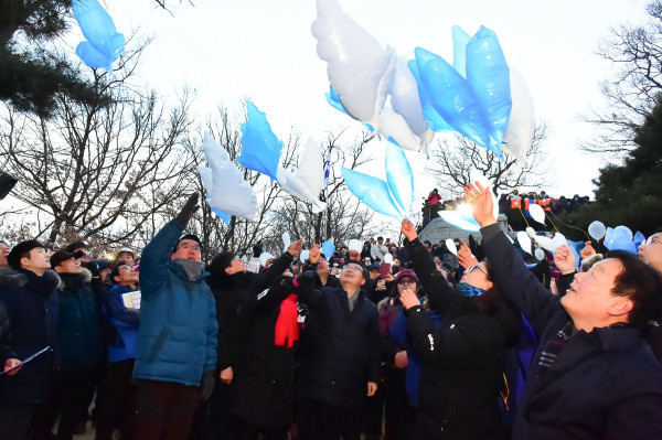 서울 중랑구가 지난 1일 오전 구 봉화산 정상에서 구민 2000여명과 함께 올해 첫 일출을 보며 새해를 힘차게 출발했다. 사진은 류경기 구청장과 주민들이 한 해의 소망을 담은 소망 풍선을 하늘에 날리고 있는 모습. (사진제공=중랑구청)