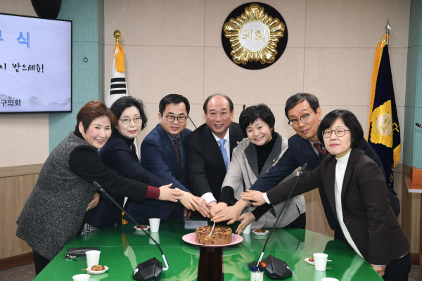 서울 영등포구의회는 2일 구의회 다목적회의실에서 ‘2019년 시무식’을 개최했다. 이날 시무식에 참석한 의원들은 2019년에는 구민의 목소리를 더욱 귀담아 듣겠다고 다짐했다. 사진은 윤 의장(가운데)과 의원들이 기념촬영을 하는 모습. (사진제공=영등포구의회)