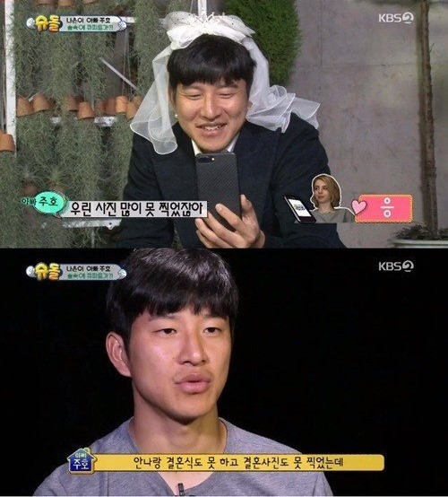 이런 가운데 박주호는 아내 안나에게 영상통화를 시도했다. 박주호는 예비부부를 봤다며 “근데 나 생각 많이 나더라”며 “우린 사진 많이 못 찍었잖아. 건후랑 나은이랑 같이 다음에 찍을 수 있으면 찍자. 둘이 찍어도 되고”라고 애정을 나타냈다. 한편 박주호는 결혼 전 나은이를 임신하며 결혼식과 결혼사진을 따로 진행하지 못한 것에 대해 안나에게 미안함을 전했다.