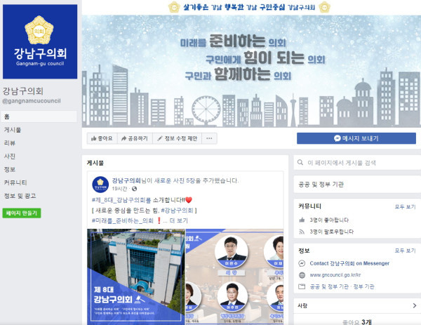 [시민일보=이대우 기자] 서울 강남구의회(의장 이관수)가 2019 기해년(己亥年)을 맞아 ▲네이버 블로그 ▲유튜브 TV ▲페이스북 ▲인스타그램 총 4종의 SNS 채널을 개설, 구민과의 소통창구를 열었다.