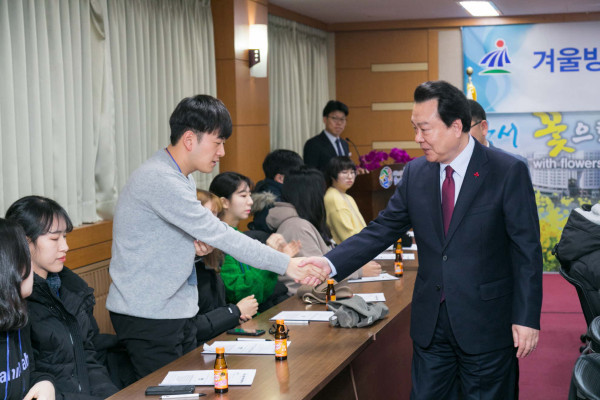 강서구는 4일 구청 대회의실에서 2019년 겨울방학 대학생 행정체험단 오리엔테이션을 개최했다. 대학생 행정체험단은 앞으로 한 달간 구청 및 동주민센터에서 근무하며 강서구청의 행정업무를 체험한다. 사진은 노현송 구청장이 행정체험단 학생들과 악수를 나누고 있는 모습. (사진제공=강서구청)