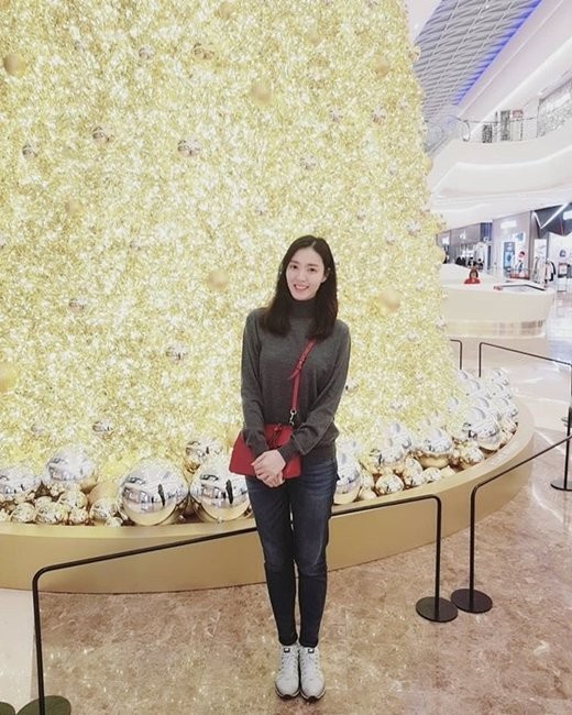공개된 사진 속 화려한 대형 트리 앞에서 정인영이 포즈 취하고 있다. 짙은 회색 터틀넥에 청바지, 운동화를 매치한 수수한 모습이지만 정인영 전 아나운서의 여전히 늘씬하고 아름다운 미모가 감탄을 자아낸다.