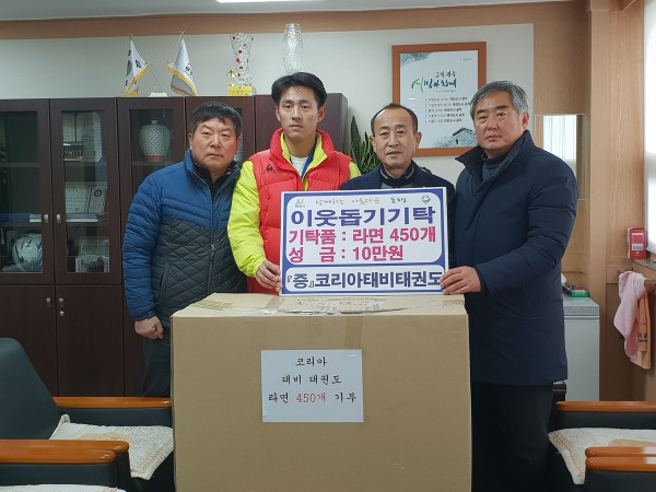 경기 광주시 회덕동에 소재한 코리아 태비태권도장 관장과 관원들은 최근 송정동행정복지센터를 방문해 어려운 이웃에게 전달해 달라며 이웃돕기 성금 10만원과 라면 450개(35만원 상당)를 기탁했다. 사진은 관계자들이 기념촬영을 하는 모습. (사진제공=광주시청)