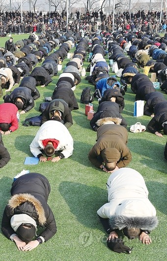 7일 충남 논산 육군훈련소에 입소하는 올해 첫 현역병 장병들이 훈련소 연병장에서 가족들에게 큰절을 올리고 있다.