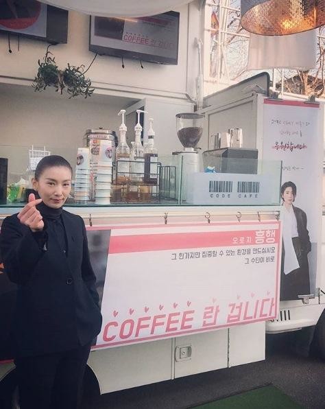 공개된 사진 속 김서형은 정경순, 장영철 작가가 보내준 커피차 앞에서 미소 짓고 있다. 김서형은 한 손으로 작은 하트를 만들어 보이고 있다.