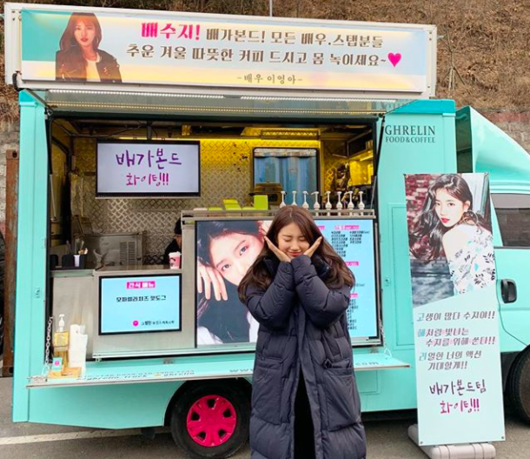 공개된 사진 속 수지는 검은색 패딩 점퍼를 입고 손으로 꽃받침 포즈를 취하고 있다. 뒤에는 이영아가 보내준 커피차가 서 있다. 이영아는 "배수지! 배가본드! 모든 배우, 스탭분들 추운 겨울 따뜻한 커피 드시고 몸 녹이세요"라는 글로 응원을 전했다.