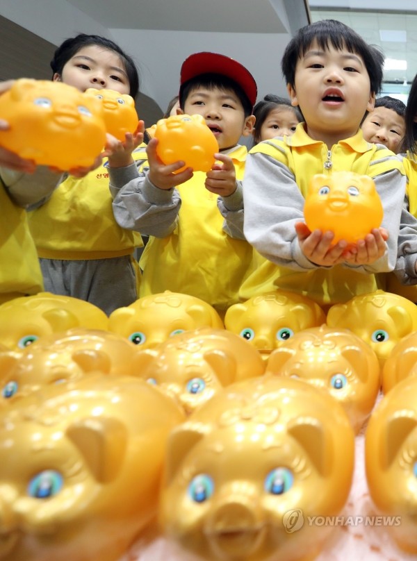 어린이들이 8일 대전 중구청에서 '이웃사랑 돼지저금통'을 들어 보이고 있다. 중구청은 기해년 황금돼지해를 맞아 돼지저금통 500개를 제작해 배포했다. 저금통으로 모은 성금은 올해 말에 사회복지공동모금회에 전달한다.