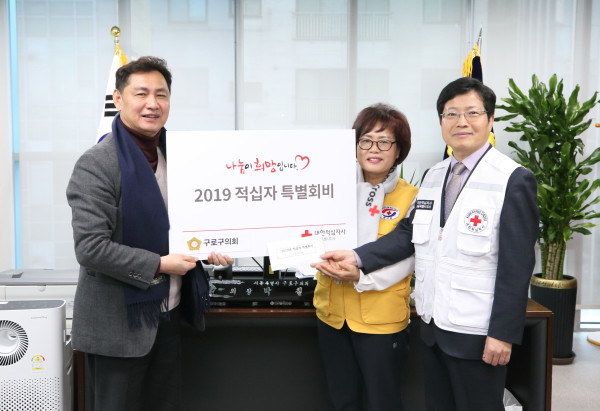 [시민일보=이대우 기자] 서울 구로구의회(의장 박칠성)가 대한적십자사 서울특별시지사에 '적십자 특별회비'를 전달하고, 대한적십자사로부터 '적십자회원유공장 은장 포장증'을 받았다.
