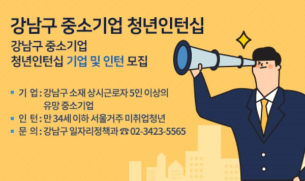 구는 인턴 기간 3개월과 정규직 전환 후 7개월, 최장 10개월 동안 1인당 월 80만~100만원의 임금을 지원한다. 인턴사원은 월 175만원 이상의 고정임금을 지급받을 수 있고, 해당기업은 95만원 이상만 부담하면 된다. 인턴대상은 만 15~34세의 미취업 청년이며, 강남구 거주자를 우선 선발할 계획이다.
