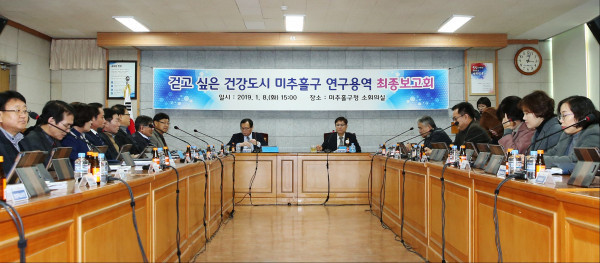 인천 미추홀구는 8일 구청 소회의실에서 ‘걷고 싶은 건강도시 조성을 위한 연구용역 최종 보고회’를 개최했다. 보고회에는 김정식 구청장과 김청원 시설관리공단이사장, 학산지속가능발전협의회 위원, 공무원 등 60여명이 참석했다. 사진은 보고회에서 김 구청장(오른쪽) 및 관계자들이 이야기를 나누는 모습. (사진제공=미추홀구청)
