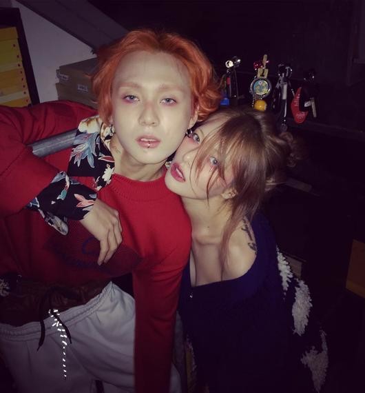 사진 속 현아는 이던과 나란히 어깨동무를 하며 카메라를 응시하고 있는 모습이다. 현아는 과감한 의상으로, 이던은 붉은 염색으로 팬들의 시선을 사로잡았다.