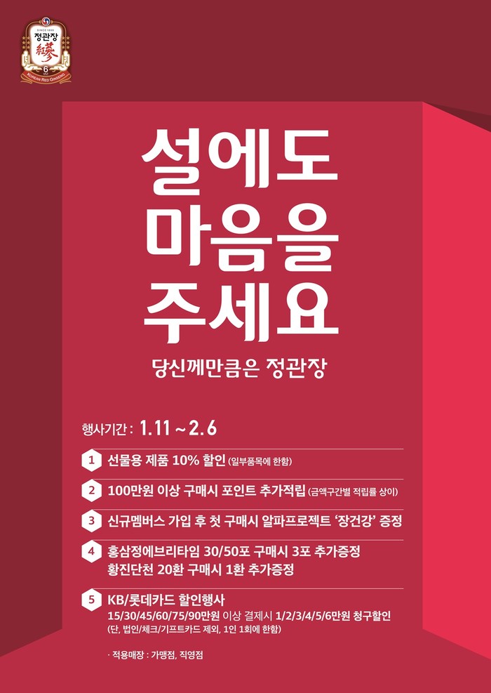 [시민일보=고수현 기자]KGC인삼공사는 다가오는 설을 앞두고 ‘설에도 마음을 주세요’ 행사를 전국 정관장 매장에서 진행한다.