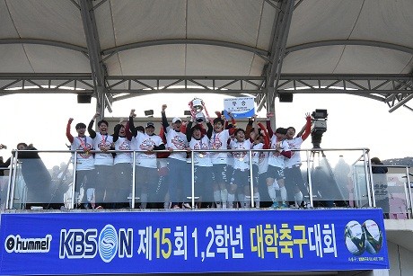 | ▲ ※사진설명: KBS N 제15회 1,2학년 대학축구대회에서 우승한 안동과학대가 기쁨을 만끽하고 있다. | ||