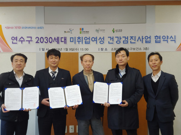 인천 연수구는 9일 나사렛국제병원, 지안건강증진센터, 송도외과의원과 2030세대 미취업여성 건강검진사업 협약을 체결했다. 사진은 협약식에 참여한 관계자들이 기념촬영을 하는 모습. (사진제공=연수구청)