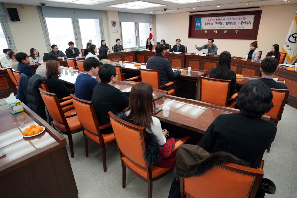 지난 7일 유덕열 서울 동대문구청장이 구청 기획상황실에서 7급 이하 직원 53명과 함께 '소통 간담회'를 열고, 구정업무, 후생복지, 개인고충 등의 폭넓은 주제에 대해 이야기를 나눴다. 사진은 소통 간담회 진행 모습. (사진제공=동대문구청)