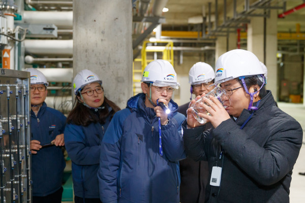 오세현 충남 아산시장이 9일 탕정에 위치한 '아산신도시물환경센터(신도시 하수처리시설)'를 방문했다. 사진은 오 시장(오른쪽)이 RO시설을 통해 생활오수에서 초순수로 정수 처리된 물을 직접 마셔 보고 있는 모습. (사진제공=아산시청)