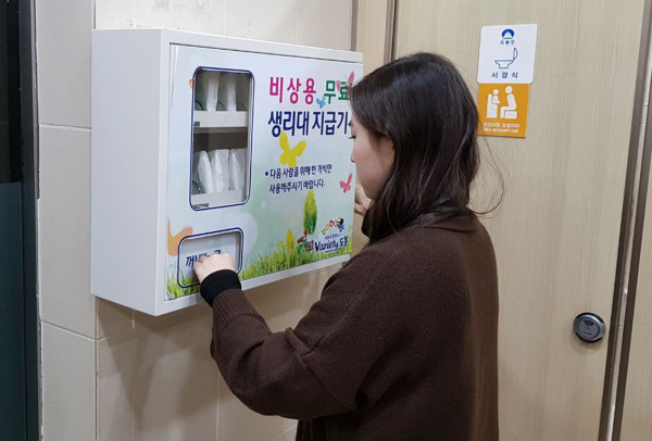 이에 따라 기존의 생리대 자판기를 개조한 무코인 레버형 기기가 설치되고, 기기당 44~45개의 생리대가 비치된다.