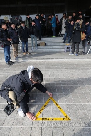 사법행정권 남용 의혹을 받는 양승태 전 대법원장의 검찰 출석을 하루 앞둔 10일 오후 서울 서초구 서울중앙지검에서 사진기자협회 소속 기자가 포토라인을 설치하고 있다.