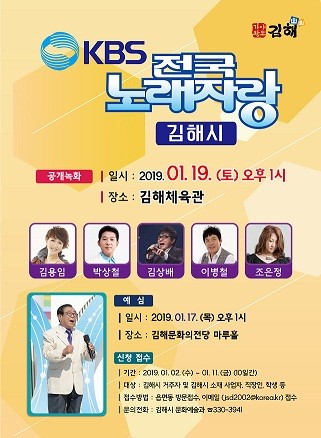 시 관계자는 “2019년 기해년 새해를 맞아 KBS전국노래자랑 개최로 2천년 가야역사와 문화가 살아 숨쉬는 가야왕도 김해를 전국에 홍보하고 시민이 화합하는 계기가 될 것으로 기대한다”고 밝혔다.