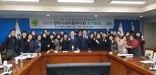 경기 양주시 새마을부녀회는 최근 양주시청 상황실에서 ‘2019년 정기총회’를 개최했다. 이날 총회에는 이성호 시장과 김용춘 새마을운동양주시지회장, 읍면동새마을부녀회장과 부회장 등 40여명이 참석했다. 사진은 총회에 참여한 관계자들이 기념촬영을 하는 모습. (사진제공=양주시청)