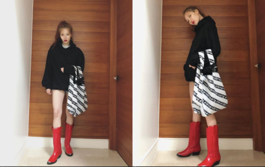 현아는 핫팬츠에 검정색 후드티셔츠를 입은 편안한 차림에도 카리스마 넘치는 분위기다. 또 빨간색 부츠로 멋을 더했다.