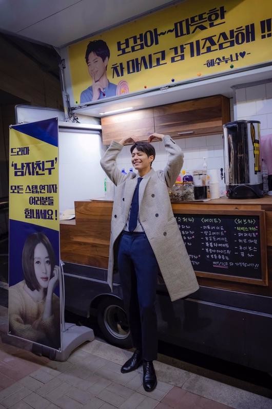 김혜수가 보내준 커피차에는 "보검아~ 따뜻한 차 마시고 감기 조심해!"라는 멘트와 " 드라마 '남자친구' 모든 스탭, 연기자 여러분들 힘대세요"라는 글이 적혀있다.