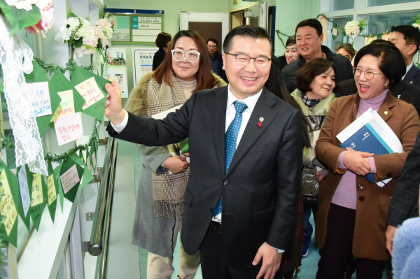 서울 중랑구는 14일 면목본동 주민센터에서 지역 국회의원 및 시·구의원, 직능단체장, 주민 등 130여명이 참석한 가운데 첫 ‘2019년 새해 16개 동 주민과의 대화’를 진행했다. 동 주민과의 대화는 오는 29일 신내2동까지 12일간 이어질 예정이다. 사진은 류경기 구청장이 면목본동 주민센터에서 주민들의 새해 소망이 적힌 메모를 살펴보고 있는 모습. (사진제공=중랑구청)