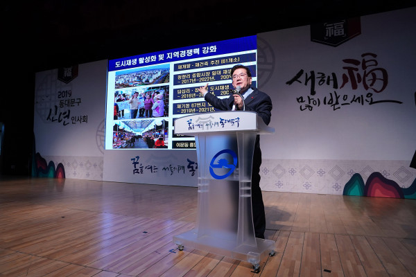 동대문구가 최근 구청 2층 강당에서 시·구의원, 구민 등 약 2000여명이 참석한 가운데 ‘2019 신년인사회’를 개최했다. 이날 유 구청장은 앞으로의 구정 운영 방향을 소개했다. 사진은 유 구청장이 프레젠테이션 하는 모습. (사진제공=동대문구청)