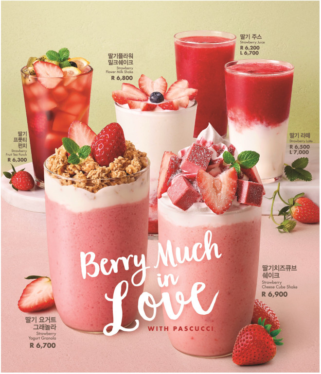 올해의 딸기음료 콘셉트는 ‘베리 머치 인 러브(Berry Much in Love)’로 “올 봄, 파스쿠찌에서 딸기와 사랑에 빠져보세요”라는 메시지를 담고 있다. 그래놀라, 딸기 치즈 케이크 큐브 등 다채로운 원재료 뿐 아니라 주스∙쉐이크∙티 등 세가지 유형으로 구성했다.
