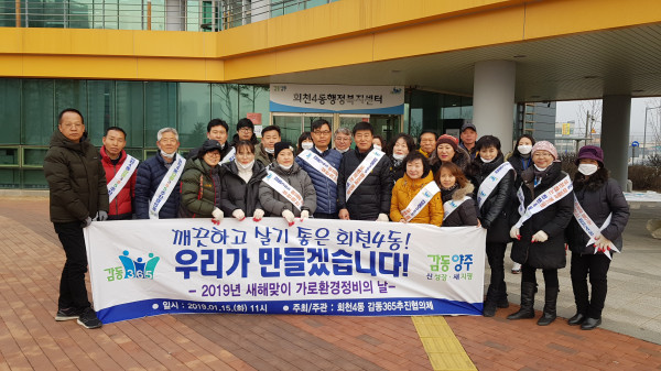 경기 양주시 회천4동행정복지센터는 15일 회천4동 감동365추진협의체 회원들과 함께 새해맞이 가로환경정비의 날 행사를 실시했다. 사진은 참여자들이 기념촬영을 하는 모습. (사진제공=양주시청)