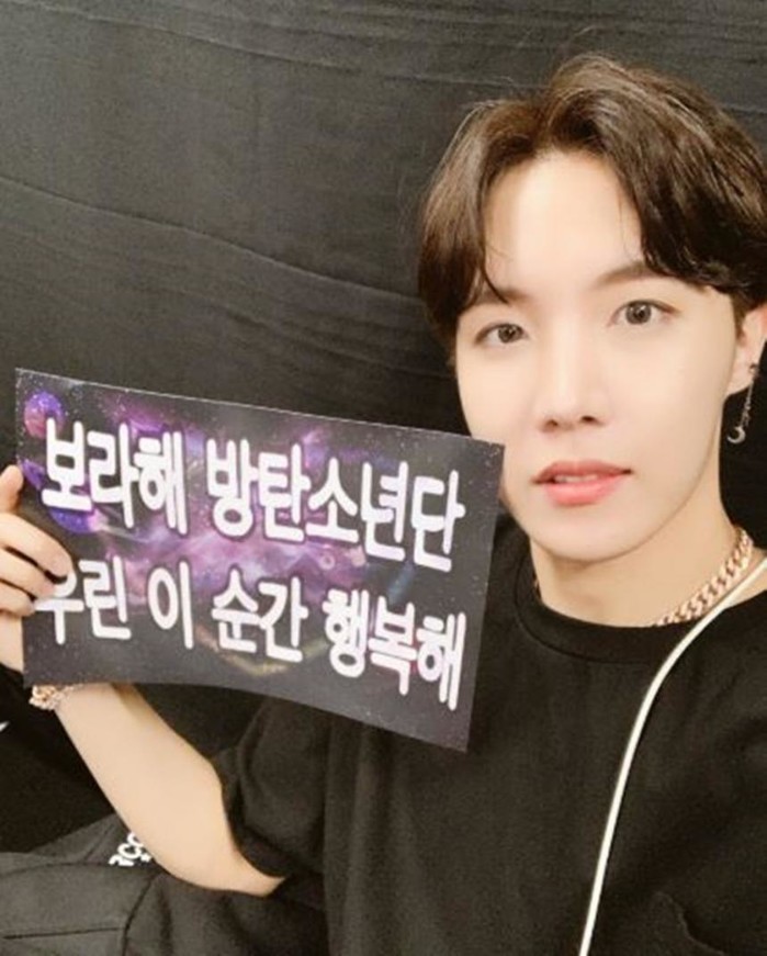 공개된 사진 속 제이홉은 ‘보라해 방탄소년단. 우리 이 순간 행복해’라고 적힌 플래카드를 들고 카메라를 응시하고 있다. 바쁜 스케줄 속에서도 팬들을 잊지 않는 제이홉의 마음이 팬들을 감동시켰다.