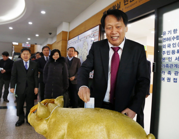구로구가 황금돼지의 해를 맞아 16일 대형 금색 돼지저금통을 구청 1층 로비에 설치했다. 설치된 저금통은 성금 모금과 함께 주민들의 기념촬영 포토존으로 이용될 예정이다. 사진은 저금통에 모금을 하고 있는 이성 구청장의 모습. (사진제공=구로구청)